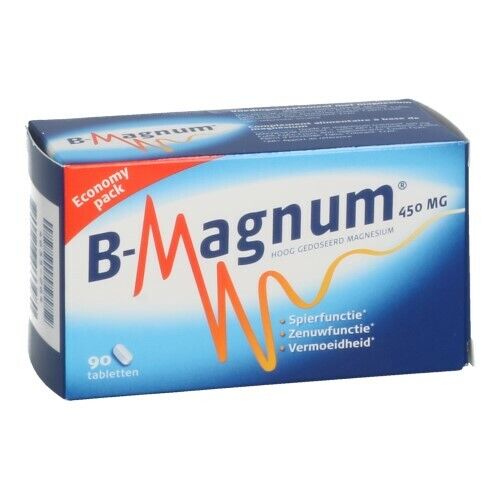 B-Magnum is een voedingssupplement met hoog gedoseerd magnesium; 450mg magnesium per tablet. B-Magnum kan gebruikt worden bij spierkrampen, vermoeidheid, zwangerschap, intensief sporten, stress. Het bestanddeel van B-Magnum; magnesium is 1 van de mineralen die onmisbaar zijn voor ons lichaam.