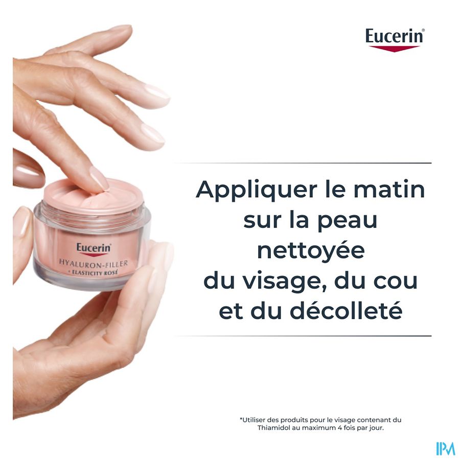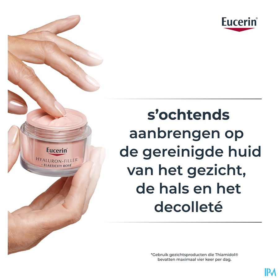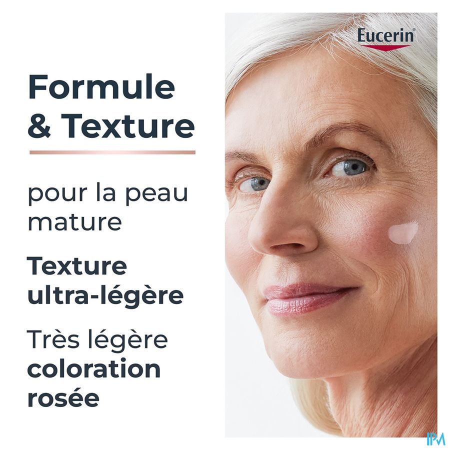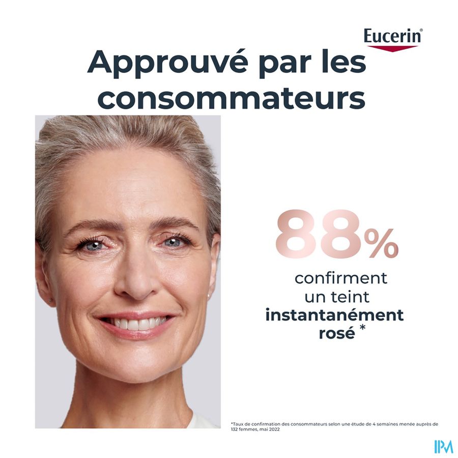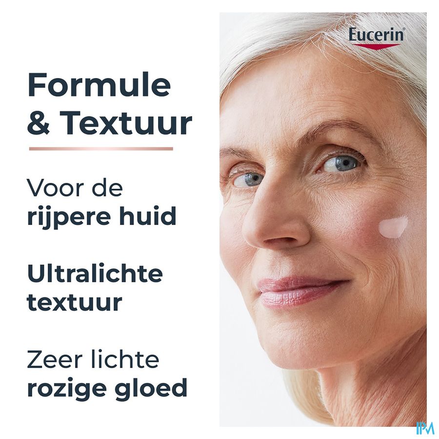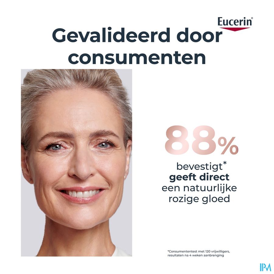 De zeer lichtroze kleur gaat voornamelijk 's ochtends een doffe en vermoeid uitziende huid tegen voor een rozige, stralende en frisse teint. Deze unieke formule geeft een natuurlijke, rozige gloed en biedt talrijke anti-age voordelen: het specifieke mengsel van Eucerin dat hoog- en laagmoleculair hyaluronzuur bevat, vult zichtbaar diepe rimpels op.