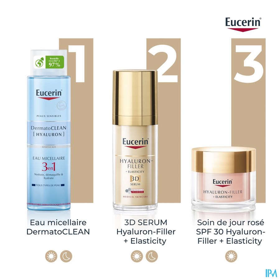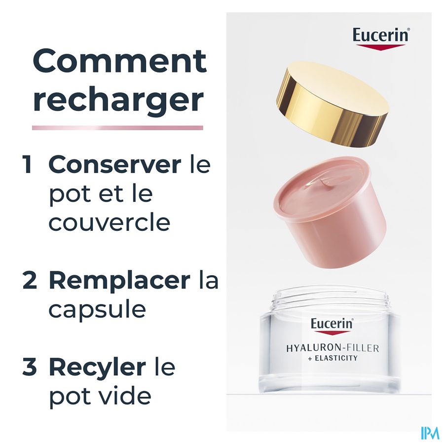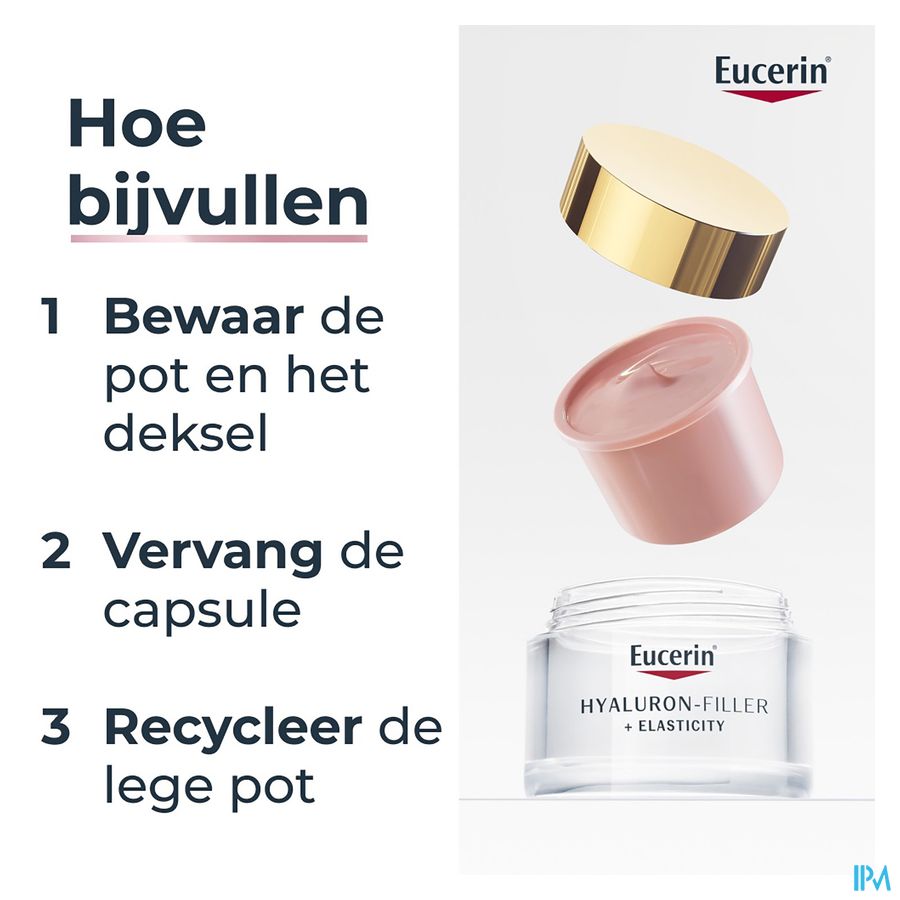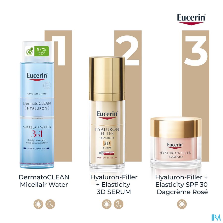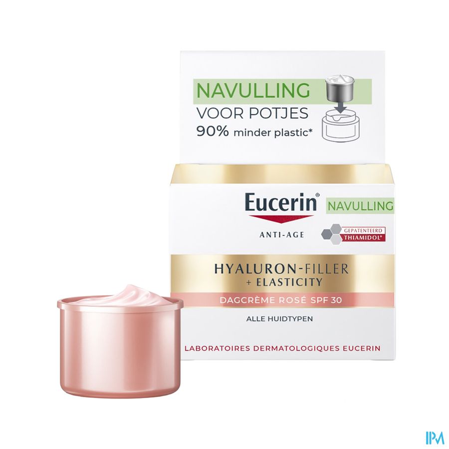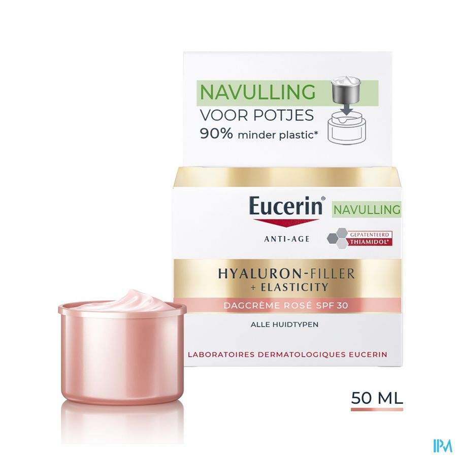 De zeer lichtroze kleur gaat voornamelijk 's ochtends een doffe en vermoeid uitziende huid tegen voor een rozige, stralende en frisse teint. Deze unieke formule geeft een natuurlijke, rozige gloed en biedt talrijke anti-age voordelen: het specifieke mengsel van Eucerin dat hoog- en laagmoleculair hyaluronzuur bevat, vult zichtbaar diepe rimpels op.