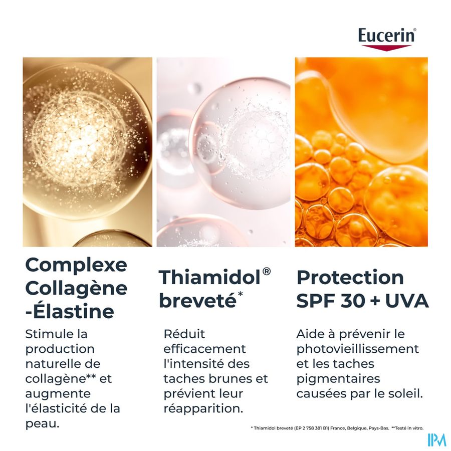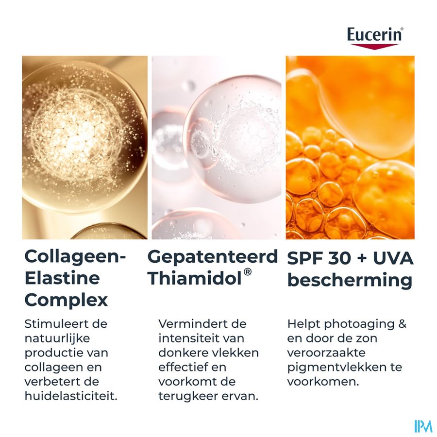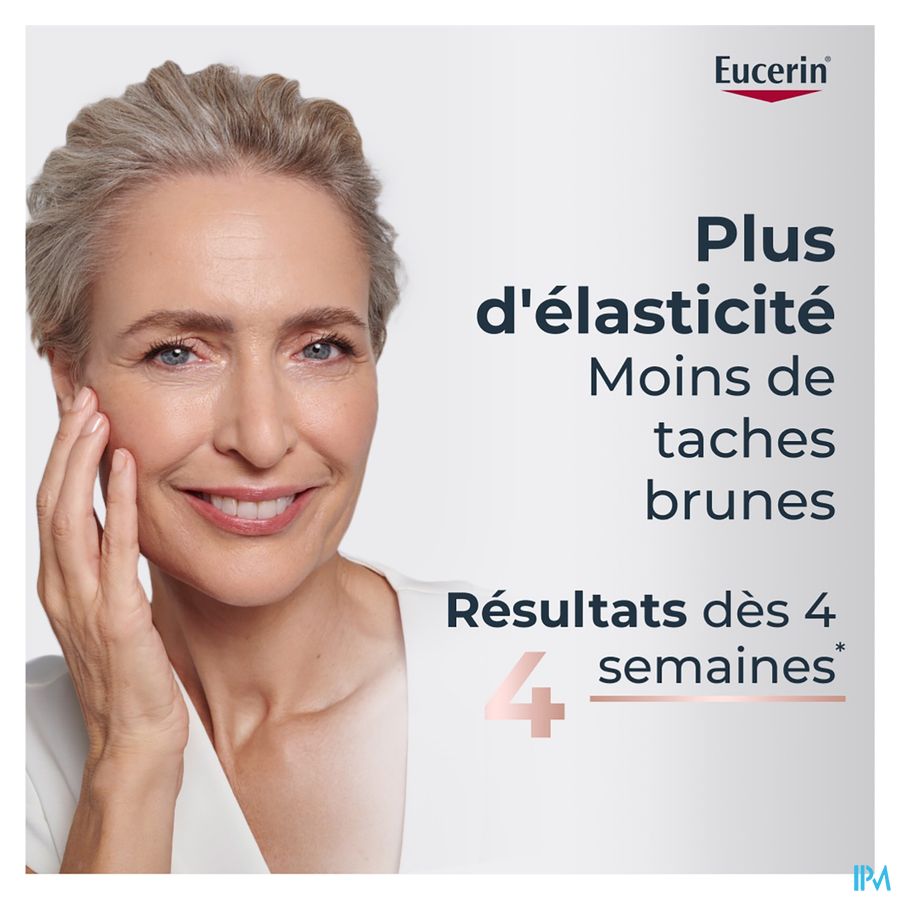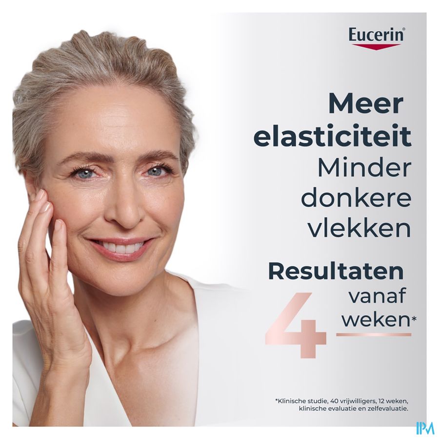 Het Collageen-Elastine Complex, een krachtige combinatie van arctiin en creatine, stimuleert de productie van collageen (in vitro tests) en verhoogt de elasticiteit van de huid. Het gepatenteerde thiamidol* van Eucerin vermindert donkere vlekken als gevolg van de leeftijd.