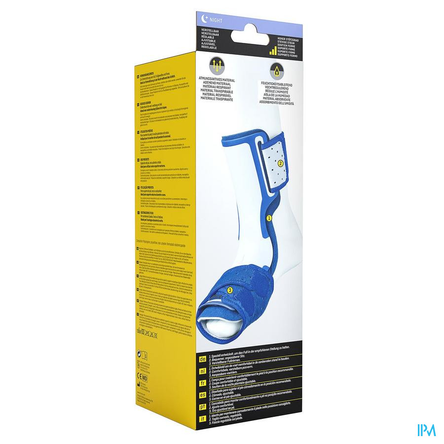 Steun voor voeten met symptomen van fasciitis plantaris;Ideaal voor ondersteuning tijdens het slapen;HOOFDKENMERKEN:Ontwikkeld om de voet comfortabel in de aanbevolen stand te houden;Comfortabele, verstelbare pasvorm;Ademend materiaal;Vochtregulerend;Ondersteunt de voet, voetboog en hiel;Ondersteund door ons deskundigenpanel van technici en medische professionals