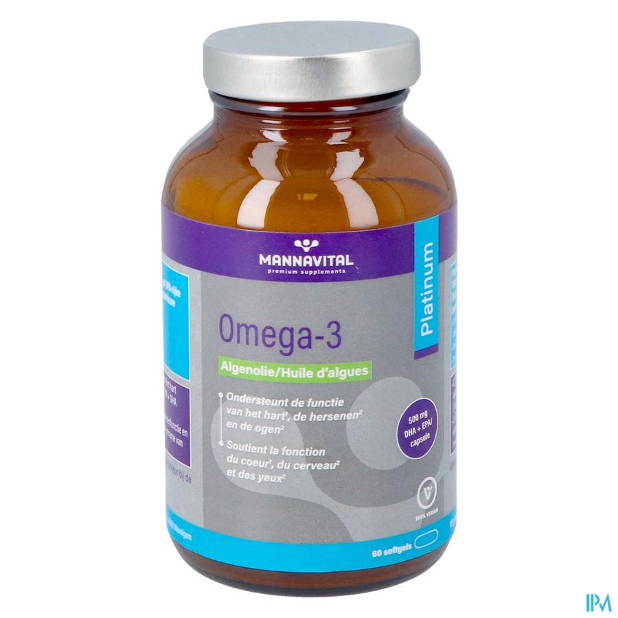 Het omega-3-vetzuur DHA is een onmisbaar structuurelement in ons lichaam, zoals in de hersenen, de ogen en de bloedvaten. Bovendien draagt het samen met het omega-3-vetzuur EPA bij tot een vlot verloop van diverse lichaamsfuncties. Helaas zijn de 'concurrerende' omega-6-vetzuren tegenwoordig heel prominent in de voeding aanwezig; omdat onevenwicht te herstellen kan de extra inname van DHA en EPA via OMEGA-3 PLATINUM ALGENOLIE van Mannavital aangewezen zijn. OMEGA-3 PLATINUM ALGENOLIE is 100 % plantaardig, van de allerhoogste kwaliteit en wordt aangeboden aan de beste kostprijs.