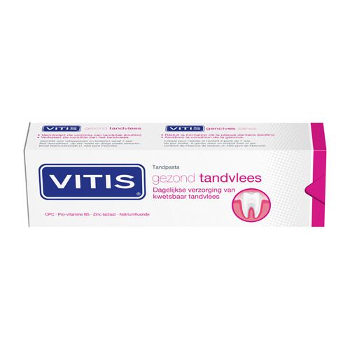 VITIS Gezond Tandvlees Tandpasta geeft een dagelijkse ondersteuning van de mondhygiëne bij geïrriteerd en kwetsbaar tandvlees. VITIS Gezond Tandvlees Tandpasta gaat effectief tandplaquevorming tegen en verzorgt en versterkt het tandvlees. VITIS Gezond Tandvlees wordt ook aanbevolen wanneer het tandvlees extra gevoelig is, bijvoorbeeld na een behandeling van (ernstige) tandvleesbehandelingen en bij een lage weerstand, zwangerschap, langdurige stress of ziekte.