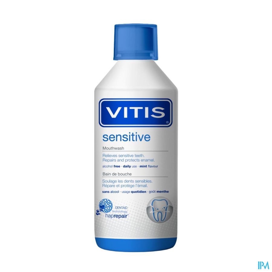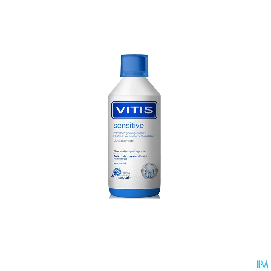 VITIS Sensitive Mondspoeling is een dagelijks te gebruiken mondspoeling tegen tandgevoeligheid. De formule is ontwikkeld met de revolutionaire DENTAID Haprepair Technologie (met 5-voudige werking). Deze Dentaidยฎ Haprepair technologie is gebaseerd op minuscule deeltjes van hydroxyapatite die zich hechten aan het tandoppervlak. Door hun minuscule grootte kunnen deze deeltjes volledig in het glazuur en de dentine worden opgenomen. Tanden en kiezen worden beter beschermd tegen invloeden van buitenaf.